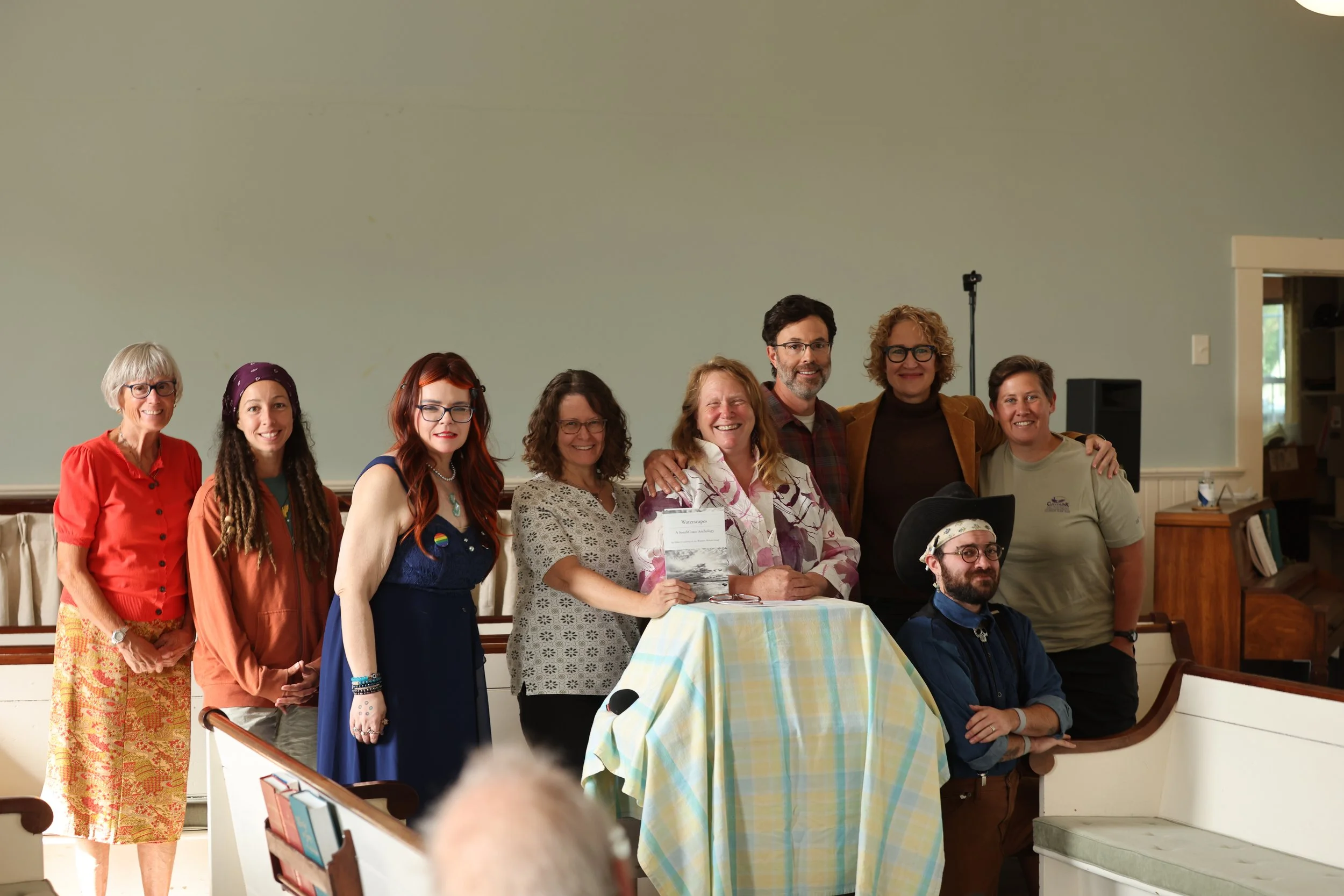 Krista Allen, another one of the writers in Waterscapes, read a poem about surfing. Except that it was also about death. Or the brush with death that surfers often encounter with each iconic attempt to ride the wave. Surfer poetry. This imagery filled the room, christening the afternoon with our first story read aloud. Midori was careful to remind us all that in this space, the next up at the pulpit was invited to take as long as they’d like to process what they had just heard. And this collision of a poem about near-death-by-surfing and then silence in a room filled with pews and blankets washed over me in a way that I didn’t know I needed that day. And still, I turn to it on pages 15-17 and revisit that collision and that near-death.